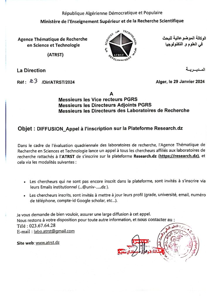 Dans le cadre de l’évaluation quadriennale des laboratoires de recherche, l’Agence Thématique de Recherche en Sciences et Technologie lance un appel à tous les chercheurs affiliés aux laboratoires de recherche rattachés à l’ATRST de s’inscrire sur la plateforme Research.dz (https://research.dz), et cela via les modalités suivantes: