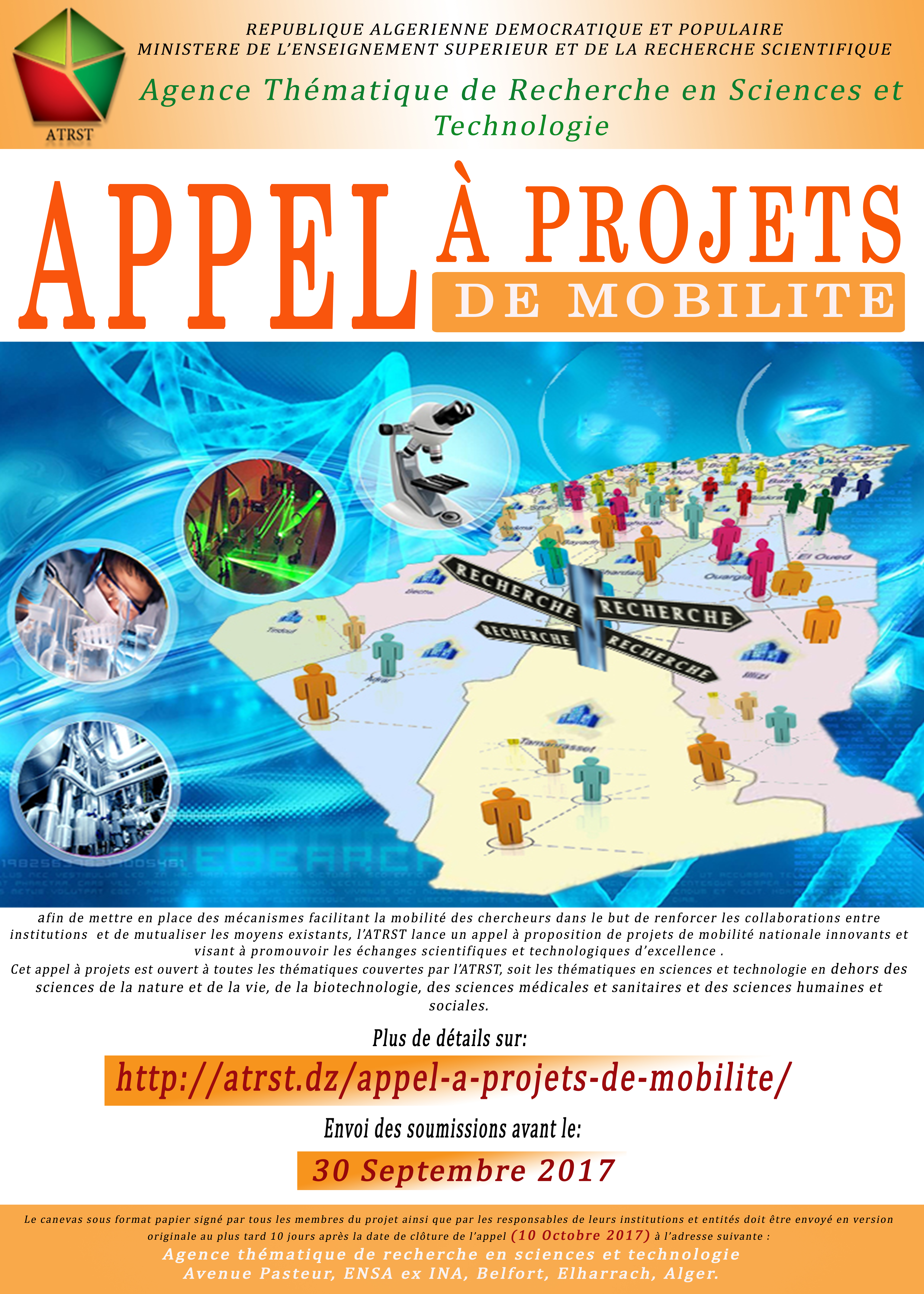 Le canevas de soumission doit être impérativement déposé avant la date de clôture de l’appel fixée au 30 Septembre 2017 par courrier électronique à l’adresse programmation@atrst.dz