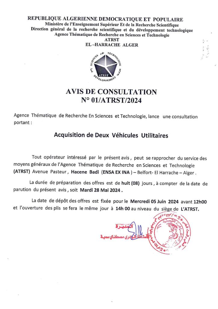 AVIS DE CONSULTATION N° 01/ATRST/2024 mai 28, 2024 Pour téléchargé l’avis de consultation en PDF cliquer ici