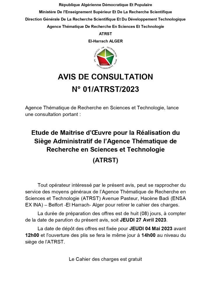 Tout opérateur intéressé par le présent avis, peut se rapprocher du service des moyens généraux de l’Agence Thématique de Recherche en Sciences et Technologie (ATRST) Avenue Pasteur, Hacène Badi (ENSA EX INA) – Belfort -El Harrach- Alger pour retirer le cahier des charges.
