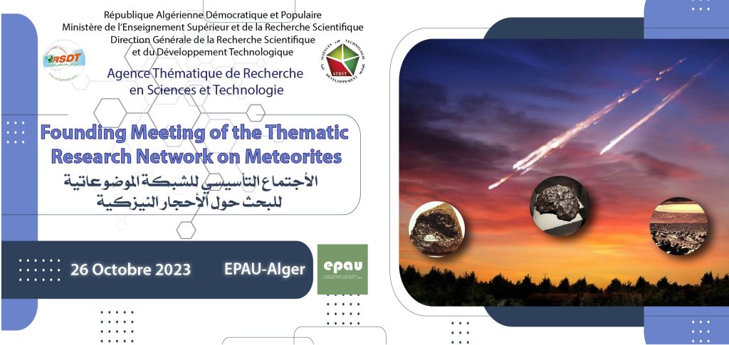 Dans le cadre de la création d’un Réseau Thématique de Recherche dans les météorites, visant entre autres à fédérer les compétences, à mutualiser les ressources, et à consolider le travail collectif entre la communauté scientifique et le secteur socio-économique liés à cette thématique, en vue d’établir des mécanismes de recherche collectifs pour faire face aux défis qu’ils présentent ; tout en proposant des stratégies et des solutions innovantes pour atténuer leurs conséquences ;